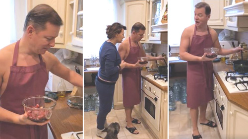 Олег Ляшко устроил целое кулинарное шоу: готовил вместе со своей женой мясо с грибами, ведя эфир со своей кухни только в тапках и фартуке.