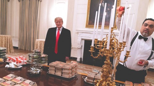 Еще одна история с едой произошла в Белом доме: из-за «шатдауна» президенту Дональду Трампу пришлось заказать пиццу, бургеры и картофель-фри для встречи с футболистами. Трамп хотел представить этот факт как победу над демократами, но американцев насмешил «фаст-фуд-ужин» на высшем уровне.