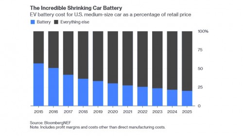 «Для автомобилей среднего размера в США в 2015 году цена аккумулятора составляла более 57% от общей стоимости машины. В этом году это 33%. К 2025 году стоимость батареи составит всего 20% от общей стоимости автомобиля», – сказано в исследовании.