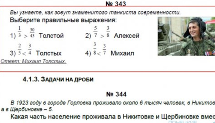 КРОМЕ ТОГО, затрагивается тема войны. Например, школьникам даются задачи о разрушениях и восстановлении объектов. Также есть задачка про боевика «Гиви», который в пособии назван «знаменитым танкистом современности». В частности, дети узнают настоящее имя «Гиви», если правильно решат задачку на дроби.
