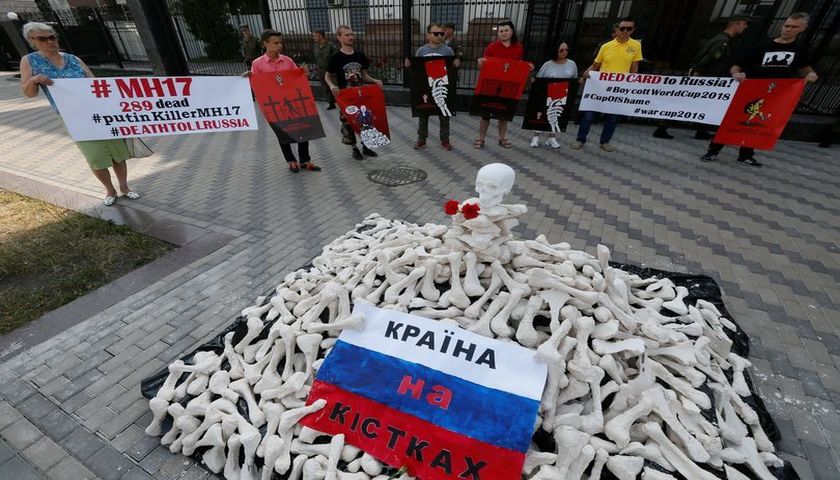 АКЦИЯ. У здания посольства активисты выложили гору из костей с надписью «Страна на костях», что стало символическим напоминанием о жертвах кремлевского режима. Участники акции держали в руках плакаты, на которых изображен российский президент Владимир Путин в крови, а также сюжеты, объясняющие причины бойкота футбольного события: катастрофа Боинга рейса МН17 , отравление экс-сотрудника ГРУ в Великобритании Сергея Скрипаля и др.