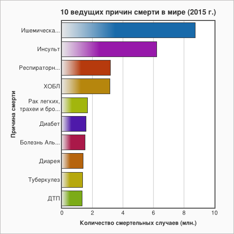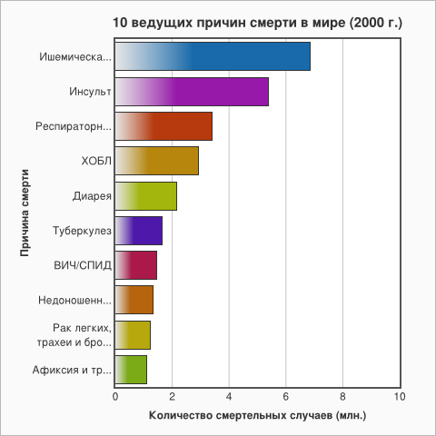 Но в позициях остальных причин смертности произошли существенные изменения. Например, родовые травмы, недоношенность и ВИЧ/СПИД перестали находиться в десятке «главных убийц человечества» (в общемировом рейтинге). А туберкулез опустился с шестого места на девятое. Зато появились новые вызовы для медицины и общества – диабет, болезнь Альцгеймера и дорожно-транспортный травматизм. А в некоторых странах в «смертельный антирейтинг» попали рак толстой кишки, рак молочной железы, а также почечная недостаточность.
