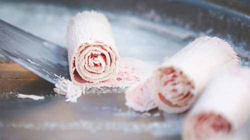 РУЛОН МОРОЖЕНОГО. В 2018 году в Таиланде изобрели мороженое, которое готовят на охлаждаемых сковородах в присутствии покупателя. Специальной лопаткой десерт срезают с холодной поверхности, сворачивая его в рулоны. Порция такого мороженого состоит из нескольких завитков мороженого, топинга и посыпки.