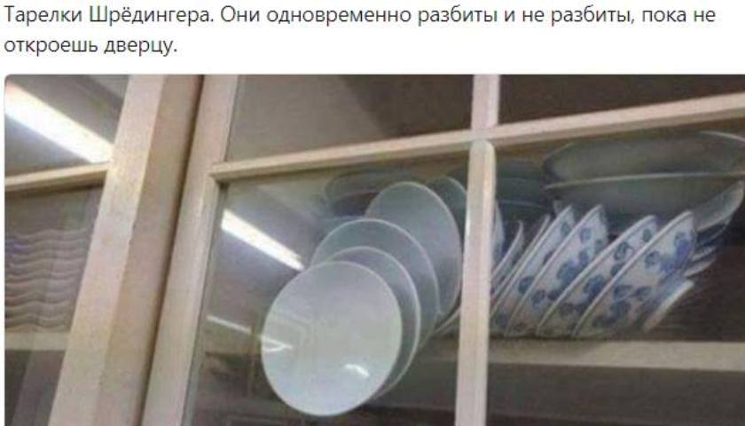 По соцсетям гуляет новый мем — тарелки Шредингера, которые одновременно разбиты и не разбиты, пока не откроешь дверцу. Парадокс налицо, но настоящая загадка в том, как спасти ценную утварь. Вот и думайте теперь…