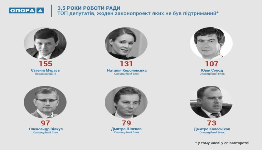 ТРУЖЕНИКИ. Лидером рейтинга стал скандальный внефракционный депутат, экс-регионал Евгений Мураев, который подал 155 бесполезных законопроектов. Чуть меньше «наработали» депутаты из «Оппозиционного блока»: Наталья Королевская (131 законопроект), Юрий Солод (107 законопроектов), Александр Вилкул (97).