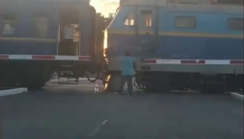 На железнодорожном переезде в Днепропетровской области женщина остановила двигающийся поезд. Видео интересного эпизода на своей странице в Фейсбук опубликовал пользователь Сергей Гаращук.