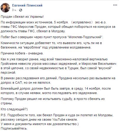 ВЕРСИЯ. По информации Плинского, на этих выходных Продан, который обещал побороться на конкурсе за должность главы ГФС, сбежал в Молдову.