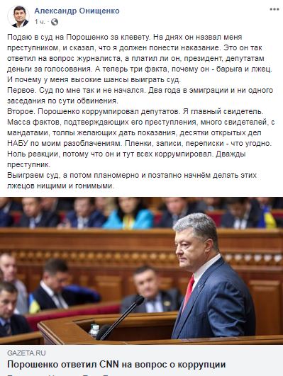 ИСК ОТ ДЕПУТАТА. Онищенко подает в суд на Порошенко за клевету. По словам нардепа, Порошенко назвал его преступником во время интервью для СNN, так Порошенко ответил на вопрос журналиста, а платил ли он депутатам деньги за голосование.